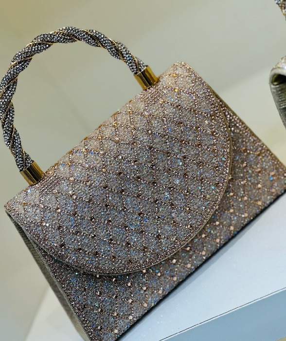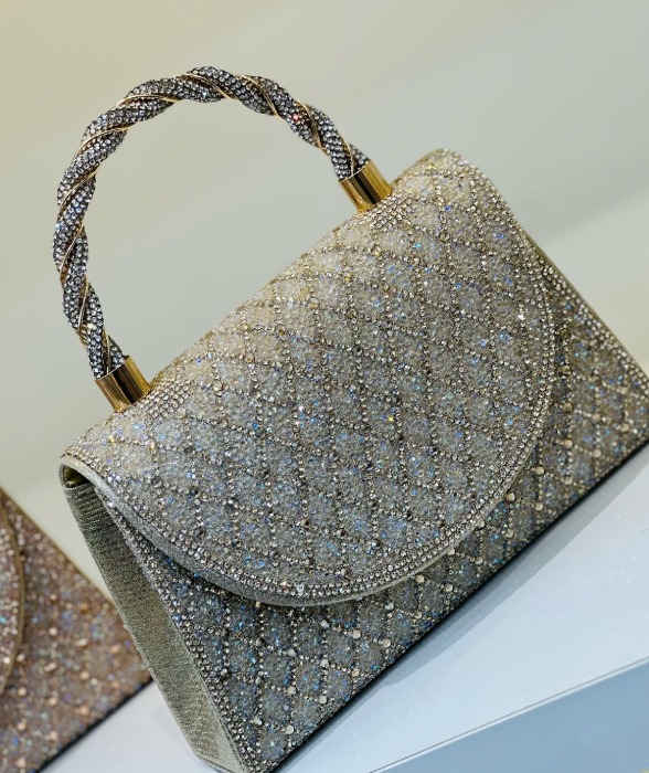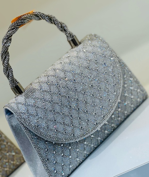 Pochette de soirée luxueuse entièrement ornée de strass scintillants. Son design raffiné avec anse tressée brillante et fermeture aimantée en fait l’accessoire idéal pour les mariages, fêtes et occasions spéciales.